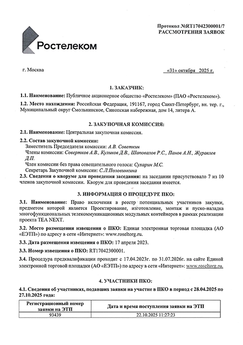 ТД "Электроагрегат" - включение в реестр потенциальных клиентов для ПАО "Ростелеком"