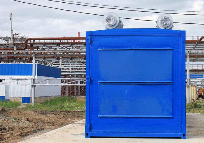 Блок-контейнер с габаритами 12000х3200х3700 разделен на два отсека: машинный и электротехнический. Габариты и масса дизель генератора в блок-контейнере допускают транспортировку железнодорожным или автомобильном транспортом.
